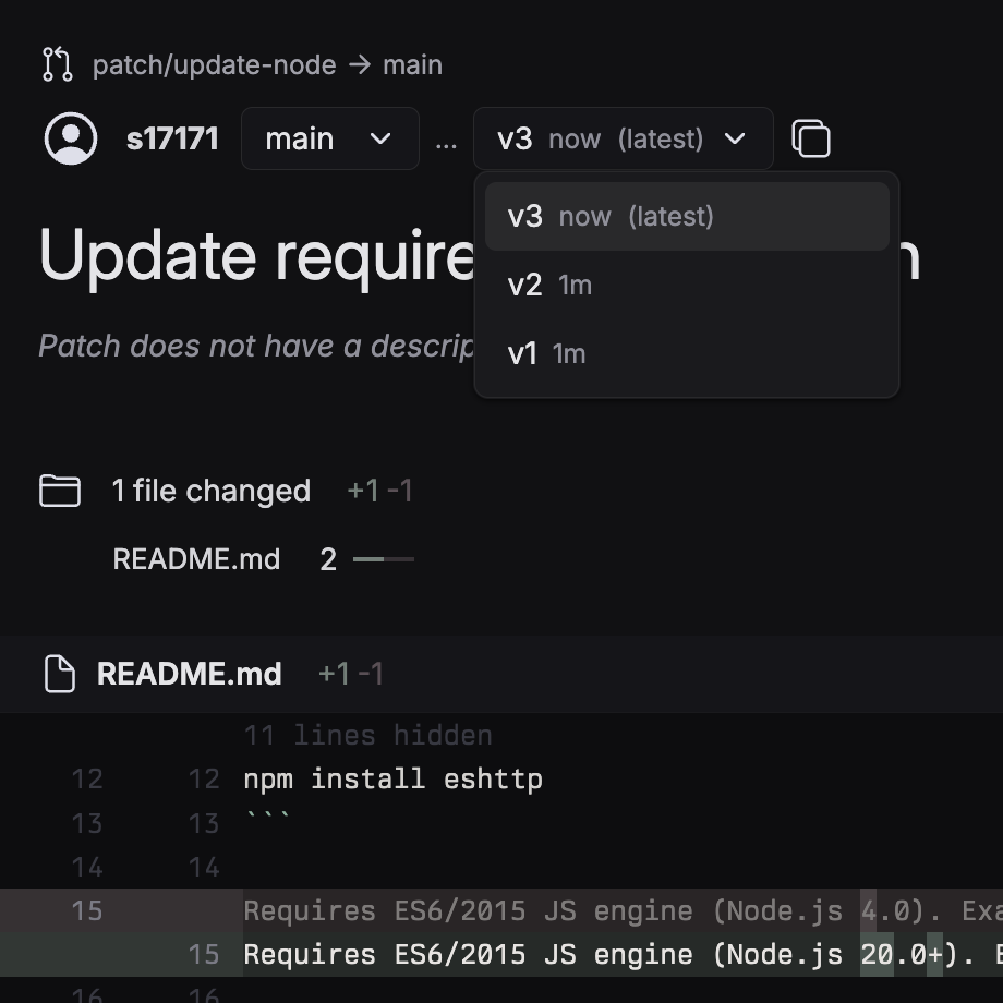 ❯ git push patch/update-node Enumerating objects: 7, done. Counting objects: 100% (7/7), done. Delta compression using up to 10 threads Compressing objects: 100% (4/4), done. Writing objects: 100% (4/4), 1017 bytes | 1017.00 KiB/s, done. Total 4 (delta 3), reused 0 (delta 0), pack-reused 0 (from 0) remote: Validating objects: 100% (4/4), done. remote: Created patch patch/update-node `Patch 1` (https://gitncoffee.com/s17171/eshttp/patch/1) To gitncoffee.com:s17171/eshttp * [new branch] patch/update-node -> patch/update-node