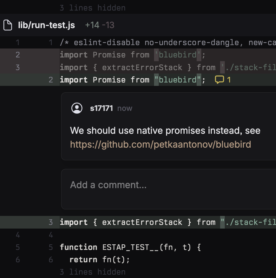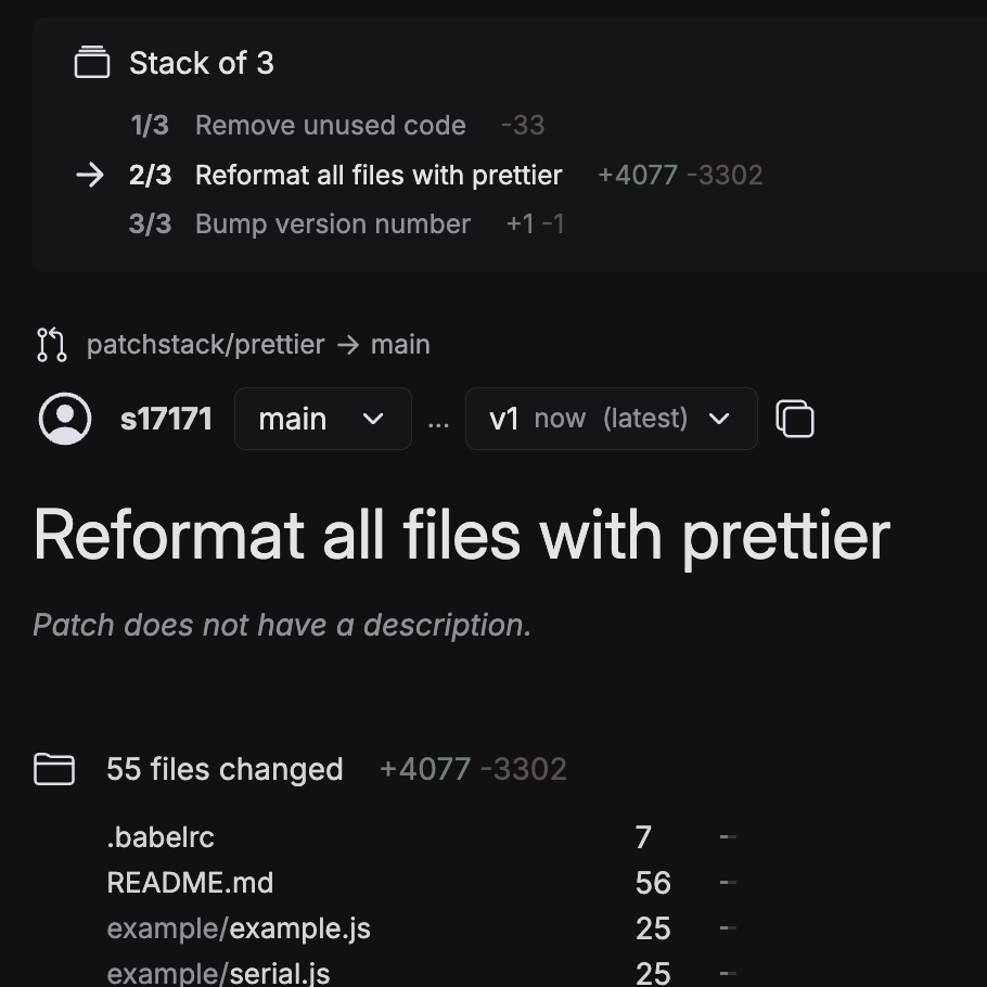 ❯ git push patchstack/prettier Enumerating objects: 132, done. Counting objects: 100% (132/132), done. Delta compression using up to 10 threads Compressing objects: 100% (62/62), done. Writing objects: 100% (71/71), 21.75 KiB | 21.75 MiB/s, done. Total 71 (delta 27), reused 49 (delta 9), pack-reused 0 (from 0) remote: Validating objects: 100% (71/71), done. remote: Created patch 1/3 patchstack/prettier `Remove unused code` (https://gitncoffee.com/s17171/estap/patch/1) remote: Created patch 2/3 patchstack/prettier `Reformat all files with prettier` (https://gitncoffee.com/s17171/estap/patch/2) remote: Created patch 3/3 patchstack/prettier `Bump version number` (https://gitncoffee.com/s17171/estap/patch/3) To gitncoffee.com:s17171/estap * [new branch] patchstack/prettier -> patchstack/prettier